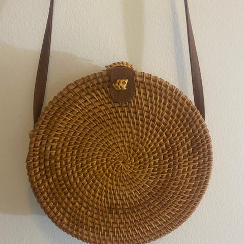 Valkoinen pyöreä rottinki crossbody laukku, nahka hihnalla ja osilla. Halkaisija noin 20cm ja syvyys noin 11cm. Ollut vain koristeena. Toridiilillä, normi postitettuna tai noutona