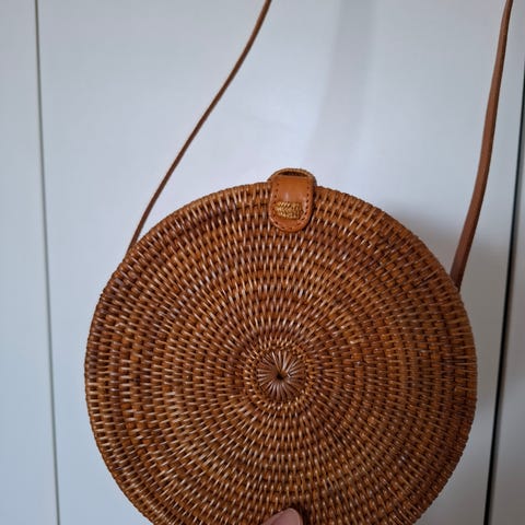 Valkoinen pyöreä rottinki crossbody laukku, nahka hihnalla ja osilla. Halkaisija noin 20cm ja syvyys noin 11cm. Ollut vain koristeena.
