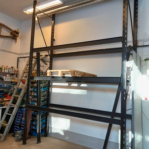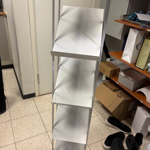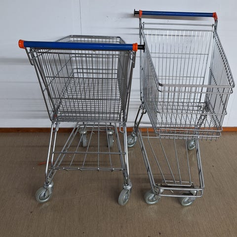 Metallinen harmaa rullakko tasovaunu. Vaunussa on suuri tasomainen ritilähylly ja pienempi ylempi ritilätaso, jotka soveltuvat erilaisten laatikoiden ja tavaroiden kuljettamiseen. Varustettu neljällä pyörällä helpottamaan siirtelyä varastossa, myymälässä tai muussa tilassa, jossa tarvitaan tavaroiden käsittelyä ja kuljetusta.