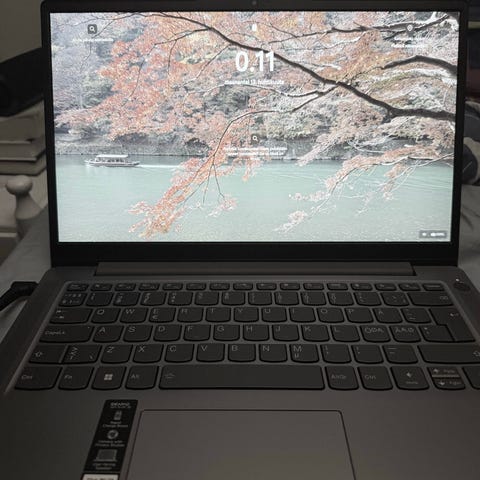 Lenovo kannettava tietokone, ulkoväri hopea ja sisäpuoli musta. Näppäimistö täysikokoinen ilman erillistä numeronäppäimistöä, suuri kosketuslevy. Näytön koko arviolta noin 14–15 tuumaa, kiiltävä pinta. Kannettava toimii Windows-käyttöjärjestelmällä (näytöllä näkyy Windows-työpöytä). Mukana tulee virtalähde ja laturi. Runko on ohut ja saranoiden rakenne mahdollistaa kannen laajan avautumisen. Sopii yleiseen kotikäyttöön, opiskeluun ja toimistotehtäviin peruskäyttöön tarvittavilla ominaisuuksilla.