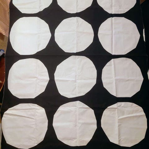 Kangaspala, jossa valkoisella pohjalla suuret mustat ympyräkuviot. Sopii esimerkiksi sisustustekstiileihin, verhoihin, pöytäliinoihin tai ompeluprojekteihin. Materiaali vaikuttaa puuvillapohjaiselta kudotulta kankaalta. Kankaan mitat eivät käy ilmi kuvista, joten ne kannattaa tarkistaa myyjältä.