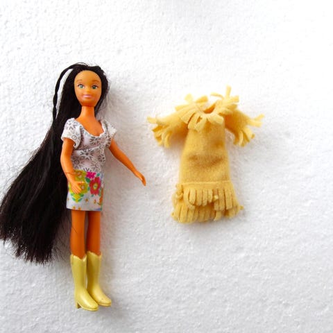 -Kohteeseen tämä nukke. Vaatteet puuttuvat lukuun ottamatta nuken ylle kiinni maalattuja asusteita.