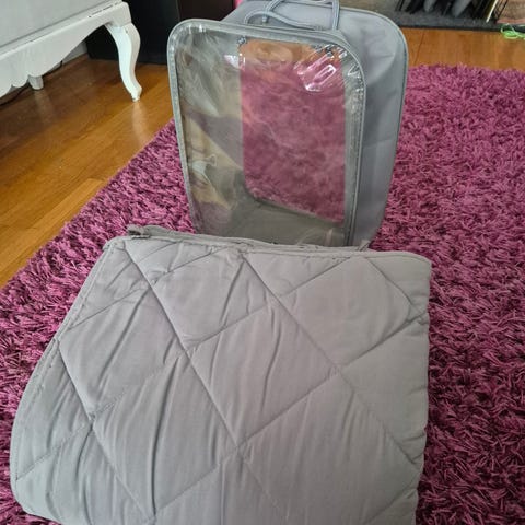 Painopeitto 4,5 kg. Koko 150x200 cm. Säilytyskassi. Olen ommellut lisänaruja pussilakanaan kiinnitystä varten. Nouto Lpr satama.