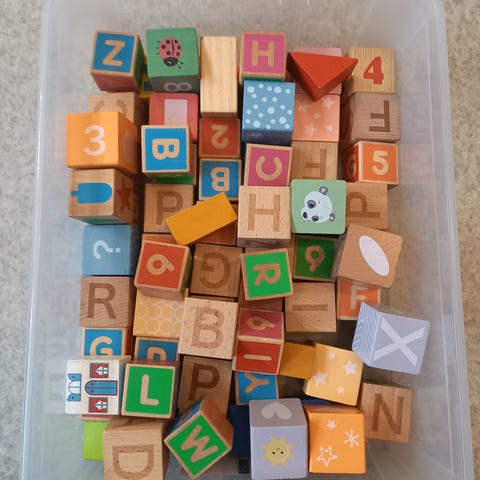 vauvan/taaperon puupalikat, enemmän ja vähemmän leikittyjä sekaisin