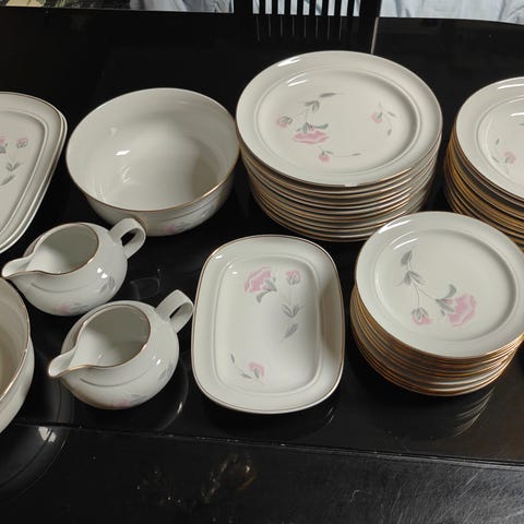 Siistissä kunnossa olevat lautaset/kukkakuviot ja kultareunat.