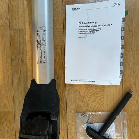 Audi kattotelineet, materiaali alumiini mustilla päädyillä. Sarjassa kaksi poikittaistankoa auton kattokiskoihin kiinnitettäväksi. Soveltuu kuorman, kuten suksiboksin tai telineiden, kiinnittämiseen auton katolle. Tarkemmat mitat ja automalli sopivuus kannattaa varmistaa merkinnöistä tai kokeilemalla omaan autoon.