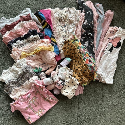 Myydään vaatepaketti kokoa 74cm. Vaatepakettiin kuuluu bodeja, housuja, muutama mekko sekä villahaalari.