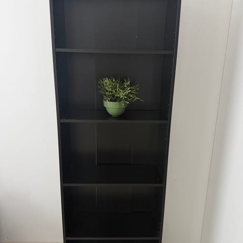 Musta billy kirjahylly kaksi hyllyä sekä kulmaosa