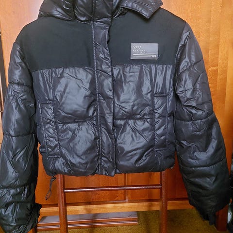 musta perus pufferi, vasemmassa taskussa pieni reikä sisäpuolella. Kokoa S