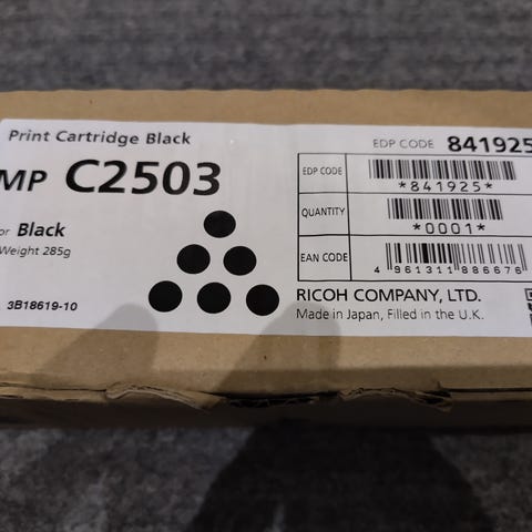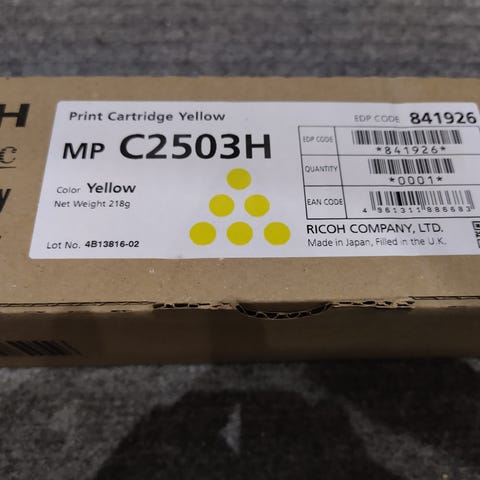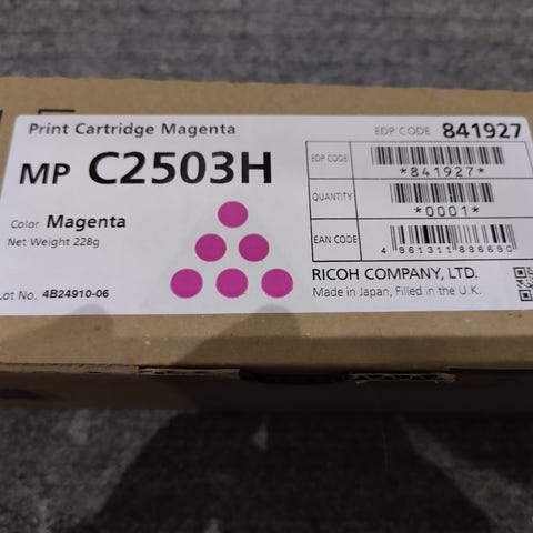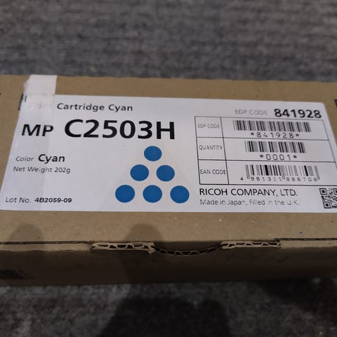 Ricoh MP C6003 värikasetti, väri cyan. Sopii Ricoh-tulostimiin, jotka käyttävät MP C6003 -sarjan värikasetteja. Pakkausmerkinnän mukaan nettopaino 400 g.