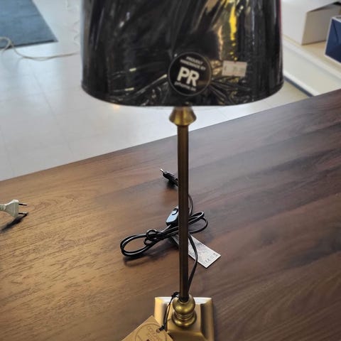 Pöytävalaisin, jossa on metallinen jalka ja neliönmuotoinen jalusta. Varjostin on tummaa, kiiltävää materiaalia sylinterin muodossa. Valaisimessa on johto ja kytkin, ja se sopii esimerkiksi työpöydälle, sivupöydälle tai yöpöydälle yleisvaloksi tai tunnelmavaloksi sisätiloihin.