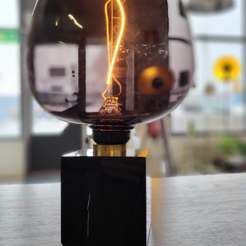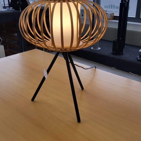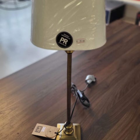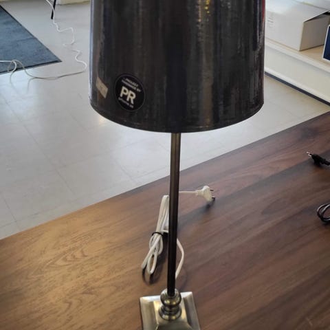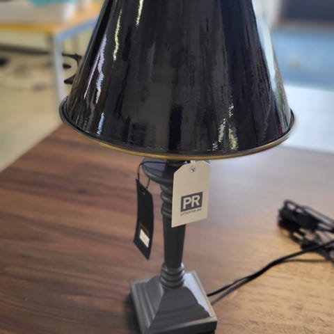 Pöytävalaisin, jossa metallinen jalka ja neliönmuotoinen jalusta. Varjostin on musta ja siinä on kiiltävä pinta. Valaisimessa on johto ja pistotulppa, ja se soveltuu käytettäväksi esimerkiksi työpöydällä, sivupöydällä tai yöpöydän valaisimena. Materiaalina on metalli, ja valaisin käyttää vaihdettavaa lamppua (polttimo ei näy kuvassa).