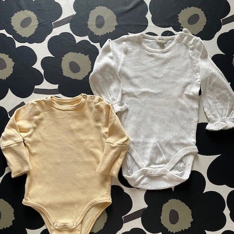 Newbie vauvan body ja housut, koko 68. Valkoinen puuvillainen setti tytöille, jossa kukkakuviointi. Pitkähihainen body ja yhteensopivat housut röyhelöyksityiskohdilla. Materiaali puuvillaa.