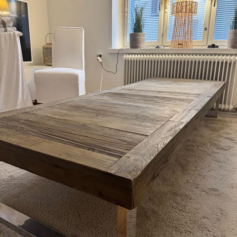 Musta metallinen runko. Pöydän pinta käsitelty parafiiniöljyllä.