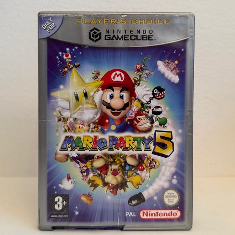 Nintendo Mario Party 5 Nintendo GameCube -peli PAL-versio. Lautapelimäinen party-peli, jossa useita minipelejä ja mahdollisuus pelata useamman pelaajan kanssa samalla konsolilla. Ikäraja 3+. Levy ja kotelo, kannessa Player’s Choice -merkintä.