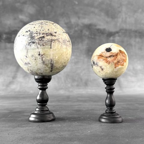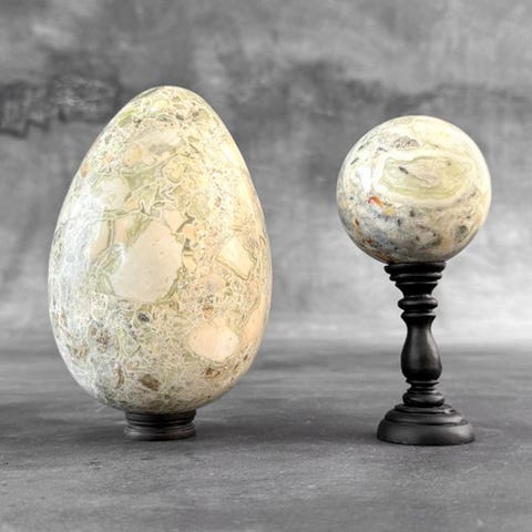 Upea pari Onyxin ja Maligano-sfääreja omilla jalustoilla.Onyx on kivilajahiekka-juomuriin kuuluva jalokaivoksi crypto-kristallinen kvartsin muoto. Se muodostuu tyypillisesti igneesi- eli magmakivien onteloihin, erityisesti vulkaanisten laavavuotojen tiloihin, joissa pii-pitoiset nesteet laskevat kvartsin kerroksia ajan myötä. Tämä prosessi luo Onyxin tunnetun karkeasti palkittuun nauhakaaviin pysyvän ulkoasun, jossa vuorottelevat eri väriset nauhat. Vaikka musta ja valkoinen nauhainen onyks on yleisintä, sitä voi esiintyä myös ruskean, punaisen, vihreän tai muun värisenä.Maligano jasper on eräänlainen jasperi, jota löytyy Indonesiasta ja joka muodostuu muinaisten vulkaanisten kuumien lähteiden alueilla. Maligano on tunnettu kontrastisista lämpimistä sävyistä sinisten ja harmaiden kanssa sekä upeista breksoituneista eli rikotun ja parannetun kuviosta, sekä hauskoista dendriittisistä kuvioistaan, mikä saa kiven usein näyttämään joenmaisemilta pienten pensaiden hiekkaa lirkuttavan puron vieressä.Lähestymist Dimensionit, mukaan lukien jalusta:# Onyx-sfääri --> Korkeus: 19,2 cm, Leveys: 10,6 cm # Maligano-sfääri --> Korkeus 14,1 cm Leveys 6,6 cmRajoitukset: > Huomaa, että nämä kuvat on otettu hämärässä studiossa, värit voivat vaihdella ympäristön mukaan.> Yksi tai useampi kuva tarjoaa tyylitellyn esityksen vastaavasta esineestä. Tarkat tiedot myytävästä esineestä löytyy muiden kuvien perusteella. Mikään tyylitellyn kuvan esine ei sisälly myyntiin.> MÄÄRÄT, JOILLAISIA mainitaan, SISÄLTÄVÄT PAKKAUSMATERIAALIN.TOIMITUS- Esine lähetetään Track & Trace -koodilla DHL Parcelin, DPD:n tai postNl:n kautta. Seurantaa päivitetään Catawiki-tilillä, kun lähetys on jätetty postin/auton kuljettajalle.- Tarkista säännöllisesti, ettet saa lähetysluetteloa palautetuksi meille, jolloin ostaja vastaa toisen toimituksen postituskustannuksista.- Espanjaan ja Portugaliin seurannan linkki ja Catawiki-tilin seurantanumero:https://clientesparcel.dhl.es/LiveTracking/Home- ME EI YHTEENSOVITA TOIMITUSTA!!!- Jos sinulla on kysyttävää paketistasi, ota meihin yhteyttä Catawiki-viestipalvelun kautta. Yritämme vastata 3 työpäivän kuluessa.