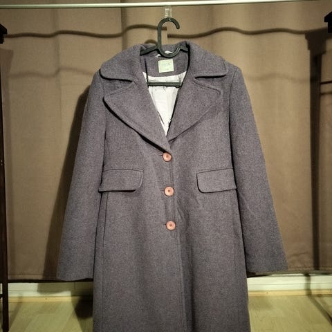Takki, koko L.Tumma pohjaväri, jossa valkoinen pilkkukuosi. Kaksirivinen napitus edessä ( toinen rivi vain koriste) ja taskut sivuilla.