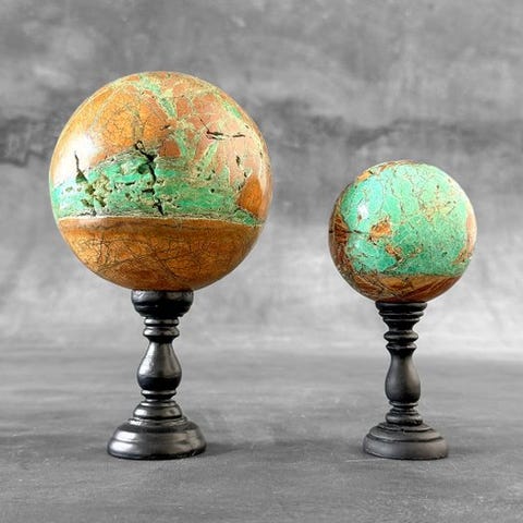 Upea pari vihreitä smithsoniittia munanmuotoisessa ja pallomaisessa muodossa, omilla räätälöidyillä jalustoillaan.Vihreä smithsoniitti, jota kutsutaan myös vihreäksi sinkspariksi, on mineraali joka kuuluu karbonaatitimineraalien ryhmään. Se on sekundaarimineraali, joka muodostuu primaaristen sinkkiesiintymien rapautumisen ja hapettumisen tuloksena. Smithsoniitilla esiintyy tavallisesti useissa väreissä, kuten vihreä, sininen, vaaleanpunainen, keltainen ja ruskea. Vihreä väri smithsoniitissa johtuu usein kuparin jäljistä. Se on suhteellisen pehmeä mineraali, kovuus Mohs-asteikolla 4–4,5, jolloin se naarmuuntuu helposti.LÄHESMITTASUURET jalustoineen# Egg : Korkeus: 16,2 cm, Leveys: 9,5 cm# Sphere: Korkeus: 14,1 cm, Halkaisija: 6,6 cmHÜVÖT: - Yksi tai useampi kuva antaa tyylitellyn kuvan vastaavasta esineestä. Myytävän esineen tarkat tiedot löytyvät muista kuvista. Tyylitellyssä kuvassa olevia esineitä ei ole myynnissä mukana.- MAINITTU PAINO SISÄLTÄÄ PAKKAUSMATERIAALIN.LÄHETYS- Tuote lähetetään seurantanumeron kanssa DHL Parcelin, DPD:n tai postNl:n kautta. Seuranta päivittyy Catawiki-lottisi, kun pakettisi on jätetty kuljetukseen.- Tarkista säännöllisesti välttääksesi paketin palautumisen meille, jolloin ostaja vastaa toisen lähetyksen postituskuluista.- Seurannan osoitteesta Espanjaan ja Portugaliin käytä tätä linkkiä ja lisää Catawiki-lotiltasi seurantanumerohttps://clientesparcel.dhl.es/LiveTracking/Home- EMME YHDISTÄ LAHETUKSIA!!!- Jos sinulla on kysyttävää paketistasi, ota meihin yhteyttä Catawiki-viestipalvelun kautta. Yritämme vastata kolmen työpäivän kuluessa.