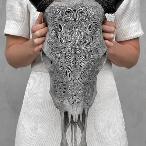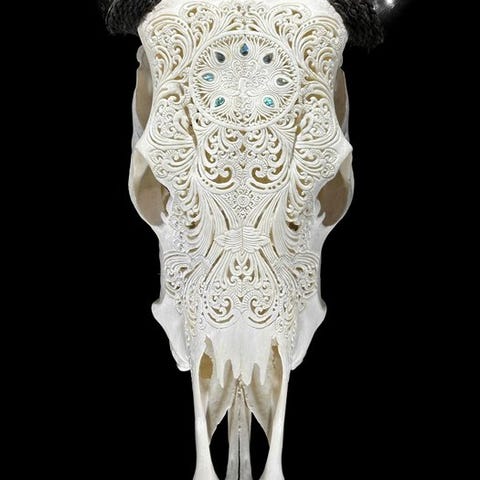 Suuri käsin kaiverrettu härkäkalvo (bull skull), kaiverrettu käsityöläisten toimesta, jotka ovat siirtäneet muinaisen kaiverrustaidon isältä pojalle.Kallo on kokonaan käsin hiottu tarkasti. Se on poikkeuksellinen koriste-esine.Kaiverrettuna on kaunis saniais- (fern) motiivi.KOKO SUURHCA DIMENSION SIDESKorkeus: 52 cmLeveys: 63 cmHUOMAUTUS:- Olemme lisänneet muutamia kuvia käsityöläisistämme työn touhussa antamaan käsityksen siitä, miltä kaiverruskallen valmistusprosessi näyttää.- PAINO, JOTA MAINITAAN, SISÄLTÄÄ RYHMÄLLISTÄ PAKKAUSTA.VAKUUTUS- Kallon takapuoleen on kiinnitetty nyöri, jotta se voidaan asentaa seinälle.- Sarvet irrotetaan kuljetuksen ajaksi ja on helppo kiinnittää uudelleen. Sarvet on aina pakattu laatikon pohjalle kallon alapuolelle. Varmista, että poistat sarvet ennen pakkauksen heittämistä pois.- Koska kyseessä on luonnollinen kallo, siinä saattaa olla pieniä halkeamia, rakoja tai kadoksessa olevia hampaita. Tämä on normaalia. Katso kuvat.- Kallot on puhdistettu ammattimaisesti, mutta pienet värimuutumat hampaan päällä voivat toisinaan esiintyä. Tämä on luonnollista ja normaalia, eikä siihen voi vaikuttaa suuresti. Katso kuvat.LÄHETYS- Tuote lähetetään Track & Trace -koodilla DHL Parcelin, DPD:n tai PostNiin kautta. Seurantatiedot päivitetään Catawik-lotillesi, kun lähetys on jätetty matkaan.- Tarkista säännöllisesti, ettet menettäisi lähetyksen vuoksi. Mikäli lähetys palautuu, ostaja vastaa toisen lähetyksen lähetyskustannuksista.- Seurantaan Espanjaan ja Portugaliin käytä tätä linkkiä ja lisää Catawiki-lotiltasi saamasi seurantanumerohttps://clientesparcel.dhl.es/LiveTracking/Home- ME EI YHDISTÄ LÄHETYSTÄ!!!- Jos sinulla on kysyttävää lähetyksestä, ota meihin yhteyttä Catawiki-viestipalvelun kautta. Pyrimme vastaamaan 3 työpäivän kuluessa.