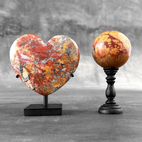 Upea setti, jossa on kolme punaisen Maligano-jaspiksen sienimäistä muotoa.Maligano jasper on tietty tyyppi jaspista, jota esiintyy Indonesiassa, ja se muodostuu muinaisten tulivuoren kuumavesilähteiden alueilla. Maligano tunnetaan kontrastisista lämpimistä sävyistään sinisten ja harmaiden sävyjen päällä, sekä upeista brecciated- eli rikkoutuneista ja parantuneista kuvioistaan, sekä hauskoista dendriittikuviostaan, jotka usein esittävät jokimaisemia pienten pensaiden kanssa vierivieressä solisevan joen äärellä.Arvioidut mitatKorkeus 1: 10,5 cm Leveys 1: 8,3 cmKorkeus 2: 8,4 cm Leveys 2: 5,8 cmKorkeus 3: 6,4 cm Leveys 3: 4,4 cmVASTUUNRAJOITUKSET:Ole hyvä ja huomioi, että nämä kuvat on otettu pimeässä studiolla, ja värit voivat vaihdella ympäristön mukaan.Mainittu paino sisältää pakkausmateriaalin.LähetysKohde lähetetään seurantanumerolla DHL Parcelin, DPD:n tai postNlin kautta. Seuranta päivittyy Catawiki-luettelossasi, kun pakettisi on jätetty postiin.Ole hyvä ja tarkista säännöllisesti välttääksesi pakettisi palautumisen meille, jolloin ostaja vastaa toisen lähetyksen toimituskuluista.Seurantaan Espanjaan ja Portugaliin käytä tätä linkkiä ja lisää Catawiki-erästäsi saatu seurantanumero.https://clientesparcel.dhl.es/LiveTracking/HomeEMME YHDISTÄ TOIMITUKSIA!!!- Jos sinulla on kysyttävää paketistasi, ota yhteyttä meihin Catawiki-viestipalvelun kautta. Yritämme vastata kolmen työpäivän kuluessa.