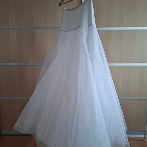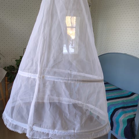 Kerran vanhojen tansseissa käytetty 6 vanteen vannehame. Koko säädettävissä noin S-L (vyötärö 60-100cm). Pituus 97cm, alareunan leveys 110cm.