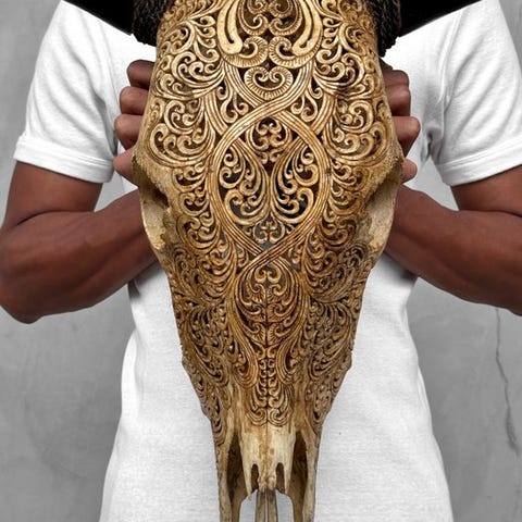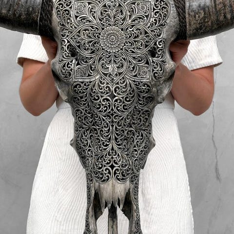 Suuri buffalokallo, jota käsin kaiverraavat lahjakkaat balilaiset käsityöläiset. Heidän isänsä on välittänyt ikivanhan kaiverrustaidon pojilleen. Tämä kallo on täysin kaiverrettu. Kaiverrus on poikkeuksellisen korkealaatuinen.Kallon sisään on kaiverrettu kaunis kukkamandala-motiivi.APPROXIMATE DIMENSIONSLength: 62 cmWidth: 73 cmNOTE:- Olemme lisänneet joitakin kuvia käsityöläisistämme työssään antamaan käsityksen siitä, miltä kaiverretun kallon luomisen prosessi näyttää.- MAINITSETTU PAINO SISÄLTÄÄ PAKKAUSMATERIAALIN.THE DISCLAIMER- Kallon takapuoleen on kiinnitetty nyöri, jotta se voidaan kiinnittää seinälle.- Sarvet irrotetaan kuljetuksen ajaksi ja ne ovat helposti kiinnitettävissä uudelleen. Sarvet on aina pakattu kallon pohjan alla. Varmista, että poistat sarvet ennen pakkausmateriaalin poisheittämistä.- Koska kyseessä on luonnollinen kallo, siinä voi olla pieniä luonnollisia halkeamia, uurteita tai kadonneita hampaita. Tämä on normaalia. Katso kuvat.- Kallomme on puhdistettu ammattilaisnopeudella, mutta hampaisiin saattaa joskus ilmestyä pieniä värimuutoksia. Tämä on luonnollista ja normaalia, eikä siihen voi tehdä paljonkaan. Katso kuvat.THE SHIPMENT- Tuote toimitetaan seurantakoodin kanssa DHL Parcelin, DPD:n tai postNl:n kautta. Seuranta päivitetään Catawiki-kohteeseesi, kun pakettisi on jätetty.- Tarkista säännöllisesti, jotta pakettisi ei palaudu meille; tällöin ostaja vastaa toisen lähetyksen toimituskustannuksista.- Espanjaan ja Portugaliin seurannan saamiseksi käytä tätä linkkiä ja lisää Catawiki-kohteestasi seurantanumerohttps://clientesparcel.dhl.es/LiveTracking/HomeWE DO NOT COMBINE SHIPPING!!!Jos sinulla on kysymyksiä paketistasi, ota yhteyttä Catawiki-viestipalvelun kautta. Yritämme vastata kolmen työpäivän kuluessa.