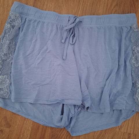 Uudet yöshortsit, koko M, väri ei pääse kuvissa ihan oikeuksiinsa, on siis violetit mustilla pitsiyksityiskohdilla