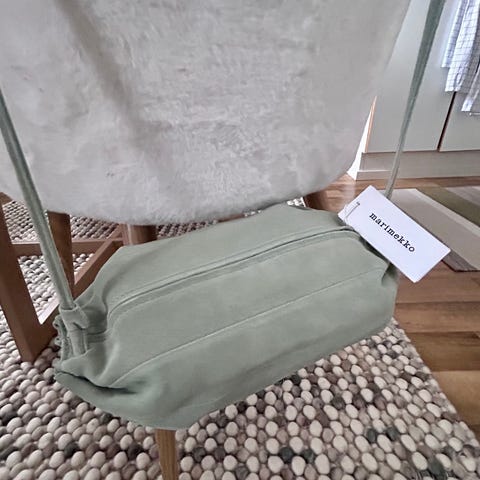 Myydään uusi/käyttämätön Marimekko Karla suede olkalaukku. Laukun väri on khaki/light grey (Marimekko värikoodi 093752-180). Laukku on valmistettu mokkanahasta, jossa on harjattu, pehmeä pinta. Laukussa on kapea olkahihna, vetoketjusuljenta ja sisäpuolella yksi vetoketjutasku.