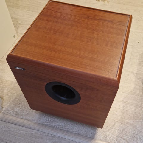 Käytetty, mutta jykevä soundinen JAMO subwoofer sekä virtajohto ja kaapeli. Oikeassa takakulmassa alhaalla kulumaa, joka kuvassa.