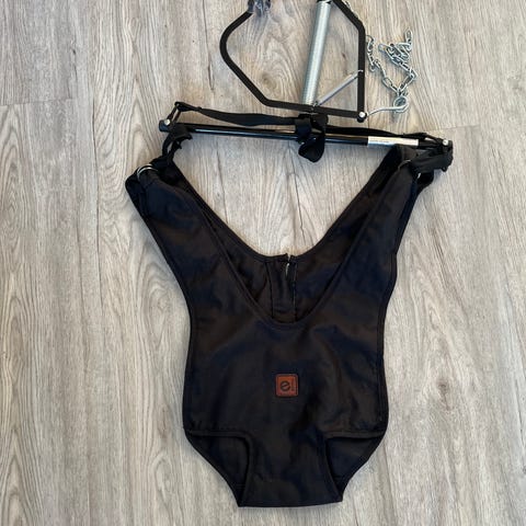 Vauvan hyppykiikku sisäkäyttöön. Kuviollinen sinisävyinen kangasistuin, jossa pehmustettu rakenne ja olkaimet. Kiikku kiinnitetään ylhäältä naruilla ja metallisilla kiinnikkeillä, mukana jousi ja puinen tanko. Soveltuu vauvalle, joka osaa kannatella päätään ja istuu valjaissa tukevasti. Käyttö edellyttää tukevan kiinnityspisteen kattoon tai oviaukkoon sekä valmistajan ohjeiden noudattamista turvallisuuden varmistamiseksi.