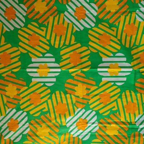 Samaa kuosia vihreä-keltainen pöytäliina myös sekä paljon muita vintage ja retro kankaita ja tekstiilejä myynnissä.