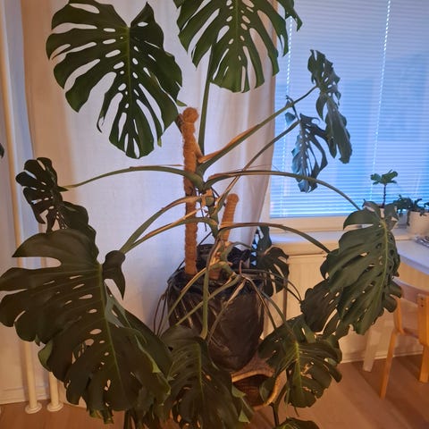 Monstera viherkasvi ruukussa. Suurikokoinen, vihreälehtinen huonekasvi, jossa on tyypilliset lehtien rei’itykset. Sopii sisätiloihin koristekasviksi. Kasvi on istutettu ruukkuun, joka helpottaa siirtämistä ja sijoittelua eri tiloihin. Monstera viihtyy valoisassa, mutta ei suorassa auringonpaisteessa, ja tarvitsee säännöllistä kastelua sekä ajoittaista lehtien pyyhkimistä pölystä. korkeus noin 180 cm
