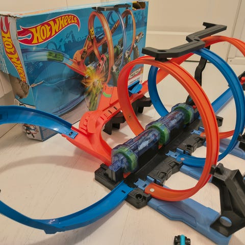 Suurin Hot Wheels- rata, silmukan korkeus ~70cm. Loop slam launcher sinkauttaa autot vauhtiin useamman kierroksen ajan. Voi laittaa monta autoa yhtä aikaa. Toimiva ja ihan hyväkuntoinen. Paristokäyttöinen.