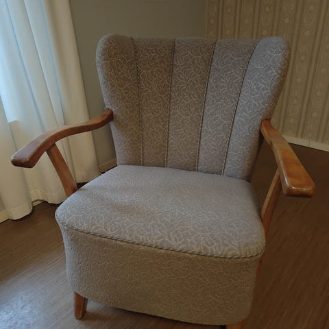 Nojatuoli jossa säädettävä jalkatuki, täysin ehjä muuten mutta kangas toki elämää jo nähnyt pää- ja käsinojien kohdilta. Koirataloudessa ollut. Vain nouto.