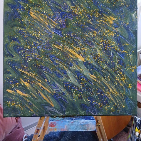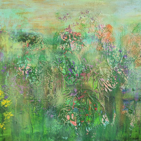 40*50, Abstrakti maalaus, jossa vihreä-sinisävyinen maisema ja vedenpintaa muistuttava alaosa. Yläosassa tummempia vihreän ja harmaan sävyjä, alaosassa vaaleampia sinisen ja turkoosin sävyjä. Keskialueella horisonttia muistuttava raita sekä oikeassa reunassa kasvi- tai kukka-aiheisia muotoja. Teos sopii seinäkoristeeksi esimerkiksi olohuoneeseen, makuuhuoneeseen tai työtilaan. Maalaus on toteutettu paksulla, tekstuuria luovalla väripinnalla. Merkitse ilmoitukseen mitat, tekniikka (esim. öljy tai akryyli kankaalle) ja mahdollinen ripustusvalmius, jos tiedossa.