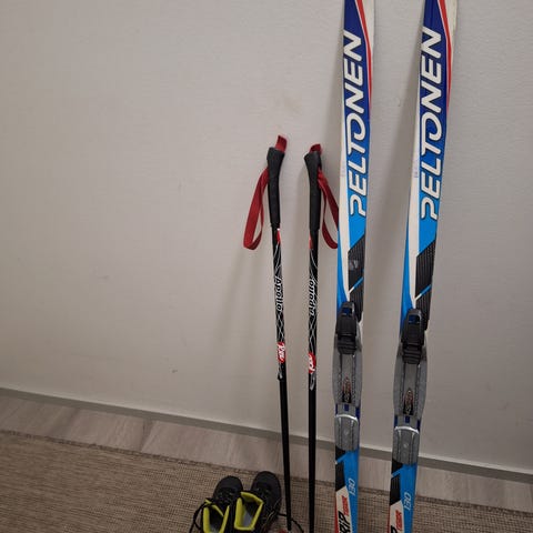 Suksilla ja monoilla hiihdetty liikuntatunnilla 5-6 kertaa. Suksissa naarmuja pohjassa, mutta ei hiihtelyä paljon haittaa. Monot ei paljoa uusille häpeä. Uusi paketti ilman sauvoja maksaa n. 100 e.
