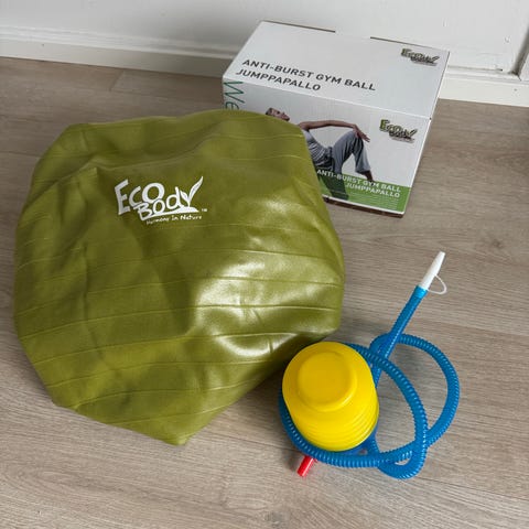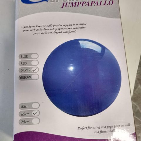 Sininen maapähkinän muotoinen jumppapallo. Soveltuu tasapaino-, keskivartalo- ja lihaskuntoharjoitteluun sekä erilaisiin kotijumppa- ja kuntoutusliikkeisiin. Pinta on uritettu paremman pidon takaamiseksi. Pallossa on venttiili täyttöä ja tyhjennystä varten. Käy aikuisille ja lapsille monipuoliseen liikuntaan ja kehonhallintaharjoituksiin.