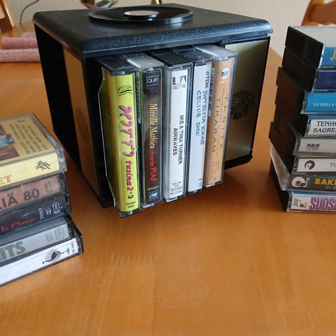 Sekalainen kokoelma äänikasetteja. Kokoelmassa useita eri esittäjiä ja levy-yhtiöitä, kasetit alkuperäisissä koteloissaan. Sopii esimerkiksi musiikin kuunteluun kasettisoittimella tai kokoelmakäyttöön. Tarkempi sisältö näkyy kuvassa kasettien selkämyksistä.