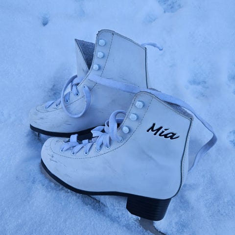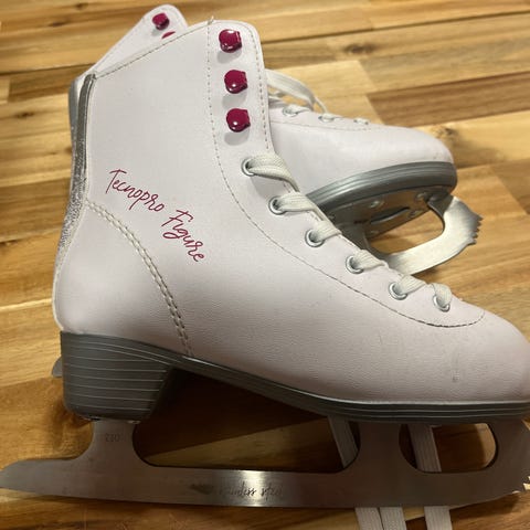 Angel lasten luistimet koko 34. Valkoiset nauhalliset luistimet, joissa keinonahkainen päällinen ja karvareunus varressa. Terät kiinnitetty ruuveilla pohjaan. Soveltuvat yleiseen luisteluun lapsille, kengänkokoon 34 sopiville jaloille.