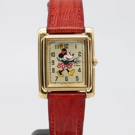 —// KUVAUKSEN //—*** Alba (Seiko) x Mickey Quartz Watch ***Malli: Vintage Alba x Disney Mickey Mouse Y131-6354 Quartz Lady's Watch Materiaali: Ruostumaton teräs kultaisessa sävyssä Kellonäyttö: Valkoinen Kellon collar: 24mm (kello kruunua ei lasketa)Koko: Ranteeseen sopiva jopa 16,0 cm. Liike: Seiko ALBA Y131 Quartz liike Varausvoima: Jopa 2 vuottaToiminto: Ajan pitäminen, Mickey Mouse -printit kellon ympärillä—// TOIMITUS SISÄLTÖ //—Aito laatikko: EiAitoja papereita: Ei—// TILANNE //—Kotelon kuluminen: ** [kotelossa karheita viivoja, kruunun lähellä töyssy]Kotelon takakannen kuluminen: * [joitain karheita viivoja]Kristallin kuluminen: -(*)Kellonäytön kuluminen: -Kädet: -Ehjänä olevat kehykset: ** [karheita viivoja ja kevyitä naarmuja]Kruunu: ** [3 töyssyä kruunussa]Rannekello tai remmi (koko yllä mainittu): - [Jälkireunaiset nahkarannekkeet, jälkikiristetty metallisidike]Extra remmien kuluminen: ** [jälkireunaiset ruskeat nahkarannekkeet, istuuvat jopa 17 cm. Käytettyä kuntoa mutta käyttökelpoinen]// TILANNE STANDARDI //- None (Paras)* - Huomattava** - Pieni*** - Keskivaikea**** - Raskas***** - Vaurioitunut (Worse)
