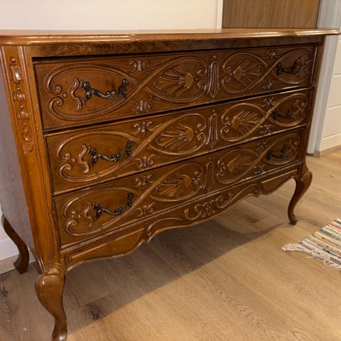 Puuviilupintainen ruskea lipasto, jossa on kaarevat jalat ja sivut. Lipastossa on kaksi vetolaatikkoa metallisilla vetimillä ja koristeellisilla yksityiskohdilla. Päällitaso ja etusarjat ovat kuvioviilutettuja. Soveltuu esimerkiksi olohuoneeseen, makuuhuoneeseen tai eteiseen säilytyskalusteeksi ja laskutasoksi. Avaimia ei ole. Vain nouto Oulun keskustasta.