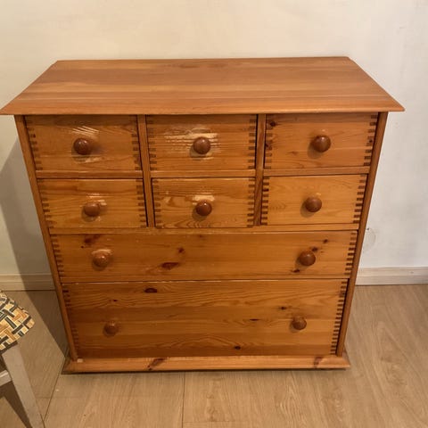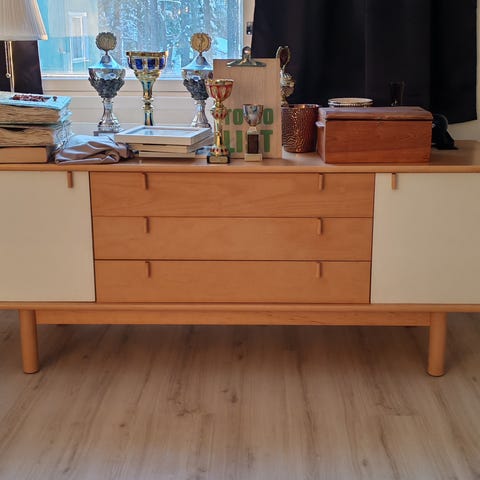 Pentik senkki, materiaalina puu. Senkissä on kaksi laatikkoa yläosassa ja kaksi kaappiovea alhaalla. Ovien pinnassa on käsitelty, hieman kulutetun näköinen puupinta ja metalliset vetorenkaat. Päällitaso on sileä ja soveltuu esimerkiksi kirjojen, kynttilöiden tai muiden esineiden säilyttämiseen ja esillepanoon. Soveltuu käytettäväksi esimerkiksi olohuoneessa, eteisessä tai ruokailutilassa säilytyskalusteena. Senkin vasemman puoleinen ovi ei mene kokonaan kiinni.