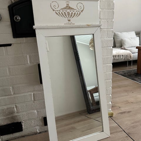 Rustiikkinen peili, jossa vaaleakerma/kulta koristeellinen kehys. Suorakulmainen malli, taustassa ripustusvaijeri seinäkiinnitystä varten. Kehyksessä on kohokuvioitu koristekuvio ja joitakin kulumajälkiä. Peilin saa vaakaan tai pystyyn. Koko 57x73 cm.