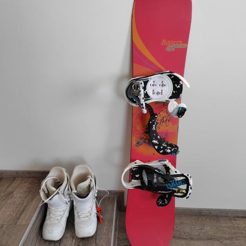 Burton Chopper 130 joka on vähän jo elämää nähnyt mutta hyvin vielä laskee pitkän aikaa. Mukaan burtonin huippu boa siteillä olevat kengät