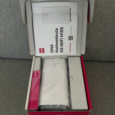 DNA Kotimokkula 5G WiFi H158 reititin. Laite tukee 5G- ja 4G-yhteyksiä ja jakaa mobiilidatayhteyden langattomasti WiFi-verkkona. Pakkauksessa on reititin, virtajohto ja käyttöohje. Soveltuu kotikäyttöön tai muuhun paikkaan, jossa halutaan jakaa mobiiliverkon yhteys useille laitteille langattomasti.