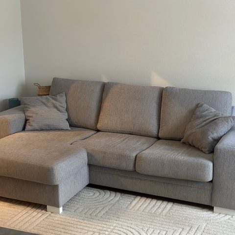 Annetaan harmaa kangassohva, jossa toisella puolella jalkarahi (puolta voi vaihtaa). Yhden istuintyynyn kulma rikki (ks. kuva). Rikkinäinen kohta ei näy selkätyynyjen alta.
