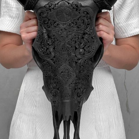 Käsin kaiverrettu naudan kallo, kaiverrettu käsityöläisten toimesta, jotka ovat siirtäneet muinaisen kaiverrustaidon isältä pojalle. Kallo on kokonaan käsin veistetty huolellisesti. Se on epätavallinen, koristeellinen kappale.Kaiverrettuna on kaunis Ketupat-aihe Turkoosikiven kanssa.HUVITUSMITATPituus: 56 cmLeveys: 41 cmHUOMIOITAVAA:- Olemme lisänneet joitakin kuvia käsityöläistemme työstä antaaen käsityksen siitä, miltä veistetyn kallon luomisen prosessi näyttää.- Huomaa, että nämä kuvat on otettu hämärässä studiossa, värit voivat vaihdella ympäristön mukaan.- JALKA EI SISÄLLY.- MAINITTU PAINO SISÄLTÄÄ PAKKAUSMATERIAALIN.VAROITUS- Kallon taakse on kiinnitetty nyöri, jotta se voidaan asentaa seinälle.- Sarvet irrotetaan kuljetuksen ajaksi, ja on helppo kiinnittää takaisin. Sarvet ovat aina pakattu kallon alapuolelle laatikon pohjalle. Poistakaa sarvet ennen pakkauksen poisheittämistä.- Koska kyseessä on luonnollinen kallo, siihen saattaa ilmetä luonnollisia minimaalisia halkeamia, uurteita tai puuttuvia hampaita. Tämä on normaalia. Katso kuvia.- Kallomme on puhdistettu ammattilaisittain, mutta hammasharja saattaa toisinaan aiheuttaa lievää värimuutosta. Tämä on luonnollista ja normaalia, eikä siihen voi vaikuttaa paljoa. Katso kuvat.TOIMITUS- Tuote lähetetään Track & Trace -koodilla DHL Parcelin, DPD:n tai PostNL:n kautta. Seurantatiedot päivittyvät Catawiki-kohteeseesi, kun paketti on jätetty.- Ole hyvä ja tarkista säännöllisesti, jotta pakettisi ei palaisi meille, jolloin ostaja on vastuussa toisen lähetyksen lähetyskustannuksista.- Seurannan Spainin ja Portugalin osalta käytä tämän linkin lisäksi Catawiki-kohteesi seurantanumeroa:https://clientesparcel.dhl.es/LiveTracking/Home- EM ME YHDISTÄ SHIPPAUSTA!!!- Jos sinulla on kysyttävää paketistasi, ota meihin yhteyttä Catawiki-viestipalvelun kautta. Yritämme vastata kolmen (3) työpäivän kuluessa.