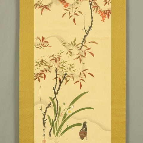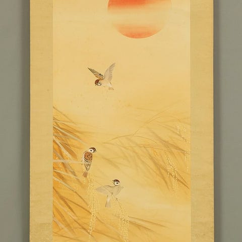 Sumun ja vuorimuotojen lempeän vuoropuhelun kehystämä tämä Seiji-kakejiku esittää rauhallisen joenvarren maiseman, jossa olkikattoinen talo, puusilta ja virtaava vesi luovat tunteen hiljaisesta paluusta päivän lopulla. Pehmeä siveltimen jälki ja hillitty väripaletti herättävät klassisen sansui-maalauksen tunnelman, kun taiteilijan signeeraus ja leima “Seiji” (栖二) vahvistavat sen perinteisen pohjan. Ripustus on viimeistelty kuviollisella kankaalla, joka täydentää rauhallista sommittelua, ja käärö on saapunut alkuperäisen tomobakon kanssa, korostaen sen huolellista säilyttämistä. Serene ja kutsuva maisema, joka soveltuu sekä ripustettavaksi että kokoelmaan.栖二 Seiji Japani taide kakejiku kakemono seinävaellus scroll / Sumuiset Vuoret Joelle Paluumaailma Sansui Maisema Originaalilla Laatikolla (Tomobako)with signature and seal 'Seiji' 栖二Koko kokonaismitat: 15" W x 65.3" H / 38.1 cm x 165.9 cmSisämitat: 9.7" W x 33" H / 24.7 cm x 84 cmMateriaalit: SilkkiTekniikka: KäsinmaalattuRullan päät: PuuPaino: 570 g mukaan lukien alkuperäinen laatikko (Tomobako)KuntoAntiikkiesineillä on alun perin taitoksia, tahroja, vaurioita ja muuta. Suosittelen viittaamaan myyntikuvien kuviin, mutta ymmärrä, että kaikkien kunto-olosuhteiden esittäminen kuvien välityksellä on vaikeaa. Erityiset huomautukset: Taitoksia hieman, vääntymää.Toimitus"ILMAINEN TOIMITUS" kaikkialle maailmaan International ePacket Lightin, EMS:n tai DHL:n kautta.
