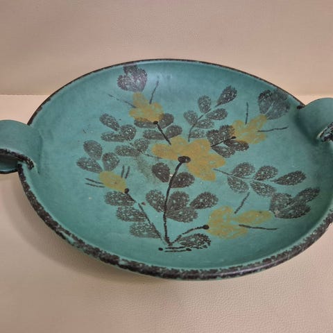 Valkoinen pohjaväri ja sininen kukkakuviointi kulhon keskiosassa. Kummallakin sivulla pienet korvat kahvoiksi. Soveltuu esimerkiksi tarjoiluun tai säilytykseen keittiössä ja kattauksissa.