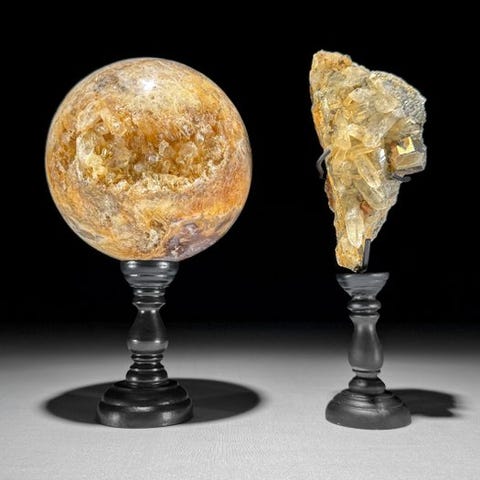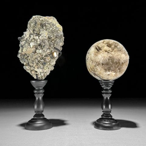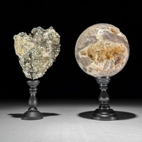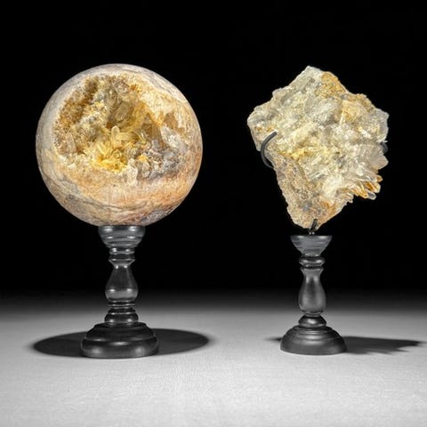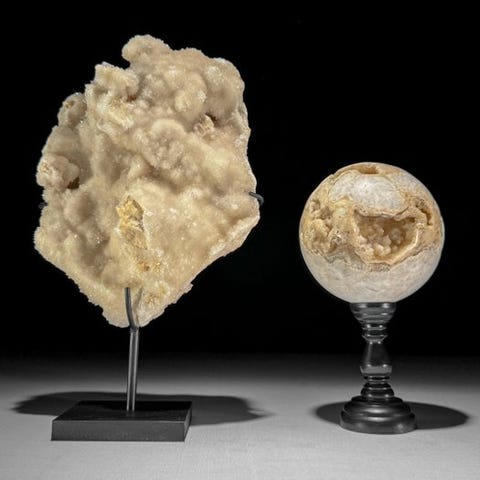 Ihastuttava Calcite-kristallikimppu ja kvartsisirppi räätälöidyillä jalustoilla.Kalkkikivikuutio viittaa kalkkikiven luontaiseen tai keinotekoisesti muotoiltuun kiteeseen, joka ilmentää kuutiomuotoa. Kalkkikivi kiteytyy yleensä trigonaalisessa järjestelmässä muodostaen rhomboedria tai skalenhedrioita kiteitä. Kuitenkin tietyissä olosuhteissa kalkkikivi voi muodostaa kuutiokiteitä. Nämä kuutiokiteet ovat suhteellisen harvinaisia verrattuna muihin kalkkikiven muotoihin. Kalkkikivikuutiot ovat luonteeltaan geometrisia ja muistuttavat kuutiota, jolla on kuusi neliönmuotoista lateraalia. Kuutioiden reunat ja kulmat ovat usein hyvin määriteltyjä, mikä luo symmetrisen ja esteettisesti miellyttävän kiven. Kalkkikivikuutioiden muodostumista voivat vaikuttaa tekijät kuten lämpötila, paine ja ympäristön kemiallinen koostumus. Kuutio-kiteet löytyvät tyypillisesti alueilta, joilla oli riittävästi tilaa kiteen kasvulle ilman muiden mineraalien häirintää.Kalkkikivikuutiot ovat kiehtovia esimerkkejä mineraalien erilaisten kiteisten muotojen monimuotoisuudesta, ja ne osoittavat kiteellisten rakenteiden luonnollista kauneutta ja symmetriaa.Kiteinen kvartsisiiri, joka tunnetaan myös selkeänä kvartsina, on mineraali, jossa pii- ja happiatomit muodostavat kiteisen rakenteen. Se on yleisin ja runsain kvartsityyppi, ja sitä löytyy monilta maailman alueilta. Kiteinen kvartsisana on arvostettu sen ainutlaatuisten ominaisuuksien ja monien käyttötarkoitusten vuoksi. Sitä käytetään usein koriste-esineinä. Metafyysisessä maailmassa kiteistä kvartsia pidetään voimakkaana parantavienergian vahvistajana, joka voi tehostaa energiaa ja tukea henkistä kasvua. Sitä käytetään usein meditaatio- ja energiahoitokäytännöissä, sillä uskotaan edistävän mielen selkeyttä, emotionaalista vakautta ja fyysistä paranemista. Lisäksi sen uskotaan parantavan kommunikointia ja intuitiota sekä auttavan manifestaatiossa ja henkisessä heräämisessä.LÄHETETTÄVÄN KOON ARVIO - sisältäen jalustan# Kuuti = Korkeus :: 20,5 cm , Leveys 13 cm# Kvartsisirppi -> Korkeus 19 cm, Halkaisija 10,4 cmVASTUUALUEET/VAROITUKSET:- Huomioithan, että yhdessä kuvan esineistä on otettu pimeässä studiokuvauksessa, värit voivat vaihdella ympäristön mukaan.- Yhden tai useamman kuvan tyyllöity esitys samankaltaisesta esineestä. Tarkat tiedot myytävästä esineestä löydät muista kuvista. Tyylejäkuvissa esinevalikoimaan ei sisälly.- MAINITTU PAINOAINEISUUS SISÄLTÄÄ PAKKAUSTAVARAT.LÄHETYS- Esine lähetetään Track & Trace -koodilla DHL Parcelin, DPD:n tai postNBin kautta. Seurantanumerot päivitetään Catawiki-luetteloosi, kun pakettisi on jätetty kuljetukseen.- Tarkista säännöllisesti välttääksesi paketin palautumisen meille, jolloin ostaja vastaa toisen lähetyksen toimituskustannuksista.- Espanjaan ja Portugaliin seuraamiseksi käytä tätä linkkiä ja lisää Catawiki-luoteloistasi peräisin oleva seurantanumerohttps://clientesparcel.dhl.es/LiveTracking/Home- EMME YHDISTÄ TOIMITUKSIA!!!- Jos sinulla on kysyttävää paketistasi, ota meihin yhteyttä Catawiki-viestipalvelun kautta. Yritämme vastata kolmen työpäivän kuluessa.